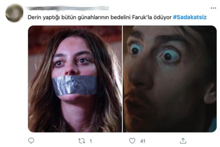 - Başrollerini Cansu Dere, Caner Cindoruk ve Melis Sezen’in paylaştığı Sadakatsiz, 14 Nisan Çarşamba akşamı 26. bölümüyle ekranlara geldi. Derin’in hala ortada olmadığı dizide flaş gerçek ortaya çıktı. Tahminleri doğru çıkan izleyiciler, hem Derin hem de onu kaçıranlar hakkında sosyal medya üzerinden yorum yaptı.