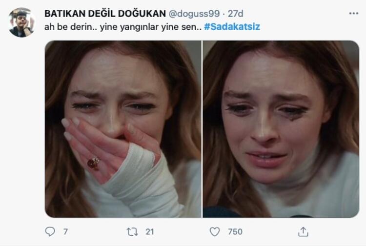 - Başrollerini Cansu Dere, Caner Cindoruk, Melis Sezen, Özge Özder’in başrollerini paylaştığı; ‘Sadakatsiz’ dizisinin 17 Mart Çarşamba akşamı yayınlanan 22’nci bölümüne Derin’in yıkılışı damga vurdu.