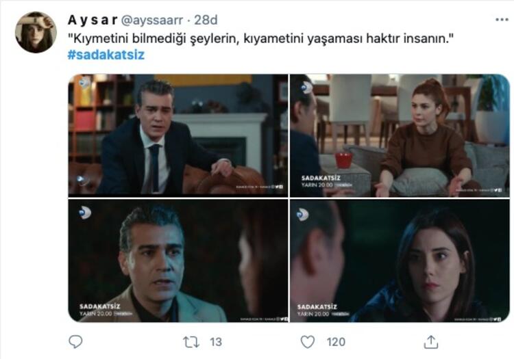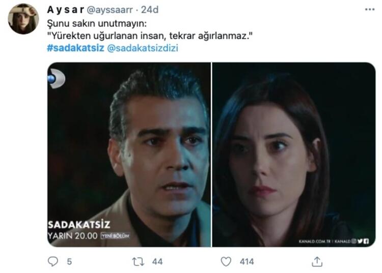 - ‘Sadakatsiz’ son bölümde; Asya’nın kaybolan tablosu Sinan ve Volkan’ı bir kez daha karşı karşıya getirdi. Ancak tablo dönüp dolaşıp Derin’e kargolandı. Aldığı paketle deliye dönen Derin ise Volkan’a bunun hesabını sordu. Ardından da Asya’nın evinin önüne kamera taktırdı.