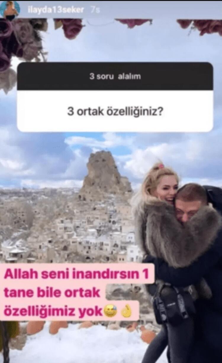 - ‘BİR TANE BİLE ORTAK ÖZELLİĞİMİZ YOK’ Aktif şekilde kullandığı Instagram hesabında sevgilisi ile verdiği pozları paylaşan Survivor İlayda, geçtiğimiz aylarda takipçilerinin sorularını yanıtlamıştı.Şeker, “Üç ortak özelliğiniz?” sorusuna, “Allah seni inandırsın, bir tane bile ortak özelliğimiz yok” yanıtını vermişti.