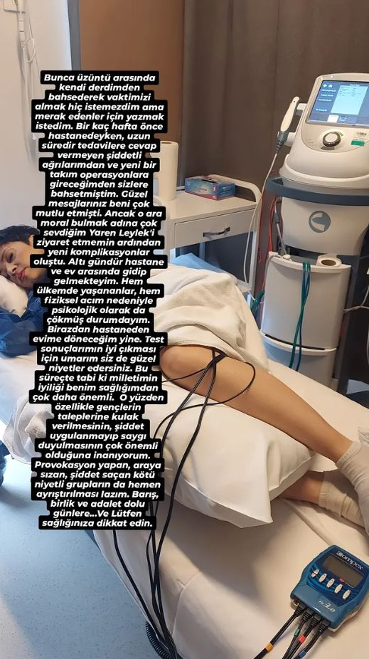 - Aydilge, yaşadığı psikolojik çöküntüyü de şu sözlerle dile getirmişti, “Hem ülkemde yaşananlar hem de fiziksel acım nedeniyle psikolojik olarak da çökmüş durumdayım. Test sonuçlarımın iyi çıkması için umarım siz de güzel niyetler edersiniz.”