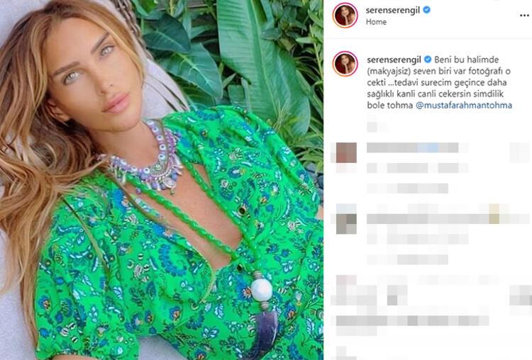 - “MAKYAJSIZ SEVEN BİRİ VAR” Seren Serengil, Instagram hesabından “Beni bu halimde (makyajsız) seven biri var fotoğrafı o çekti. Tedavi sürecim geçince daha sağlıklı kanlı canlı çekersin…” mesajıyla fotoğrafını paylaştı.