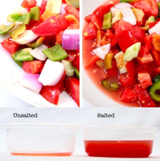 Salatanıza ekmek batırmak istiyorsanız size şimdi açıklayacağımız tüyo sayesinde salatalarınızın daha sulu olmasını sağlayabilirsiniz. Tek yapmanız gereken salataya her zamankinden biraz daha tuz atmak. Bu şekilde domatesler suyunu daha çabuk bırakacaktır.