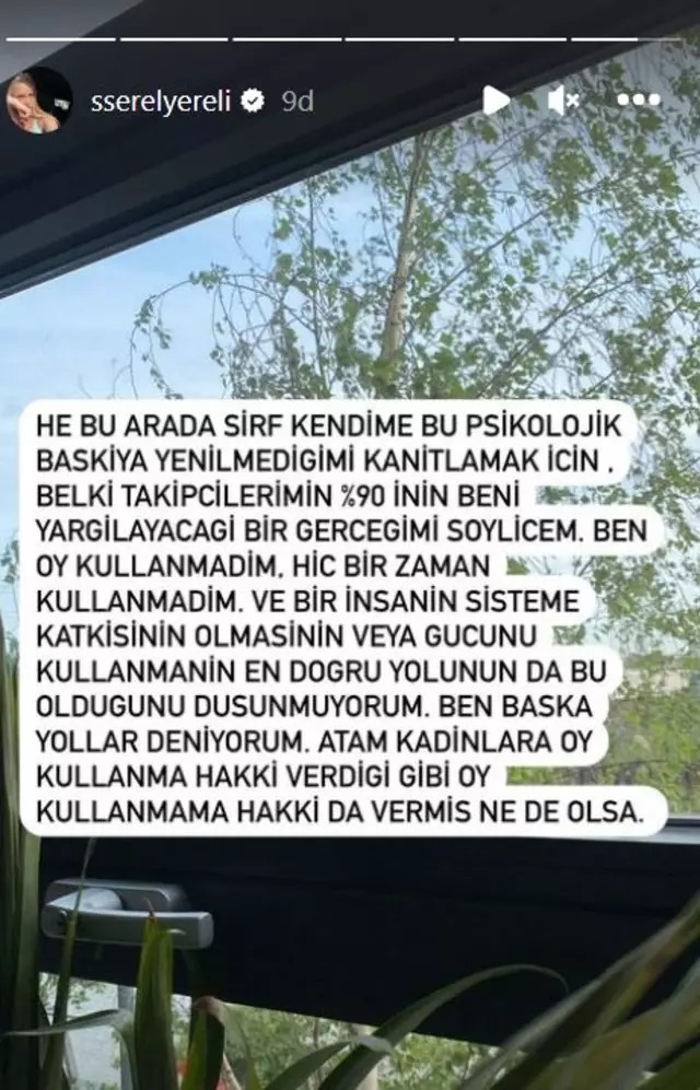 - “Serel Yereli “Bu arada sırf kendime bu psikolojik baskıya yenilmediği kanıtlamak için belki takipçilerimin yüzde 90’ının beni yargılayacağı bir gerçeği söyleyeceğim” diyen Yereli konuşmasının devamında “Hiçbir zaman oy kullanmadım. Bir insanın sisteme katkısının olmasının veya gücünü kullanmanın en doğru yolunun da bu olduğunu düşünmüyorum ben başka yollar deniyorum” dedi.(mynet.com)