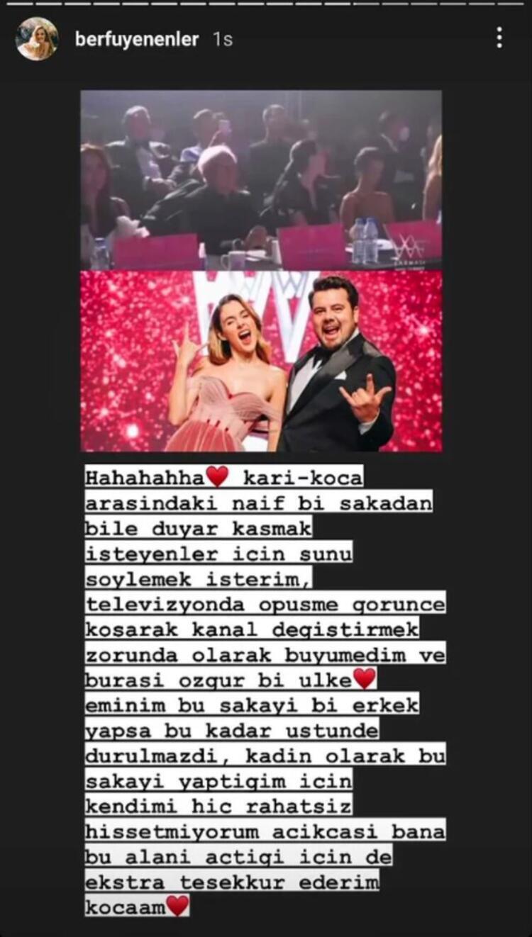 - Sosyal medyada çok eleştirilen Berfu Yenenler, “Televizyonda öpüşme görünce koşarak kanal değiştirmek zorunda olarak büyümedim ve burası özgür bir ülke. Eminim bu şakayı bir erkek yapsa bu kadar üzerinde durulmazdı. Kadın olarak bu şakayı yaptığım için hiç rahatsızlık hissetmiyorum” dedi.
