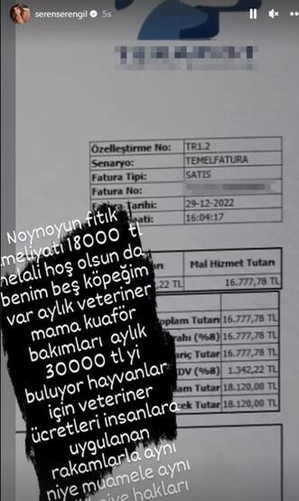 - Instagram hesabından köpeğinin tedavi masraflarını gösteren makbuzu yayınlayan Seren Serengil, “Noynoy’un fıtık ameliyatı 18 bin TL. Helali hoş olsun da benim beş köpeğim var; aylık veteriner, mama, kuaför bakımları 30 bin TL’yi buluyor” mesajını yazdı.(CNNTÜRK)