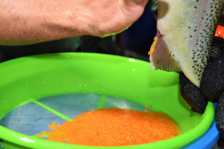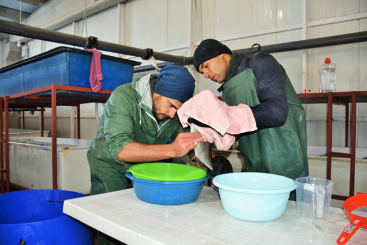 - Bölgedeki doğal su kaynaklarının üzerine kurulan tesiste yetiştirilen balıklardan dişi ve erkek olanlar, sağım zamanında farklı havuzlara alınıyor.