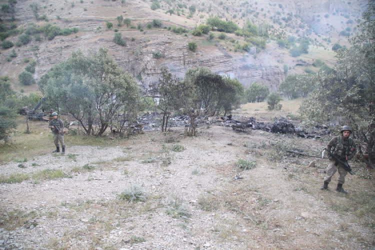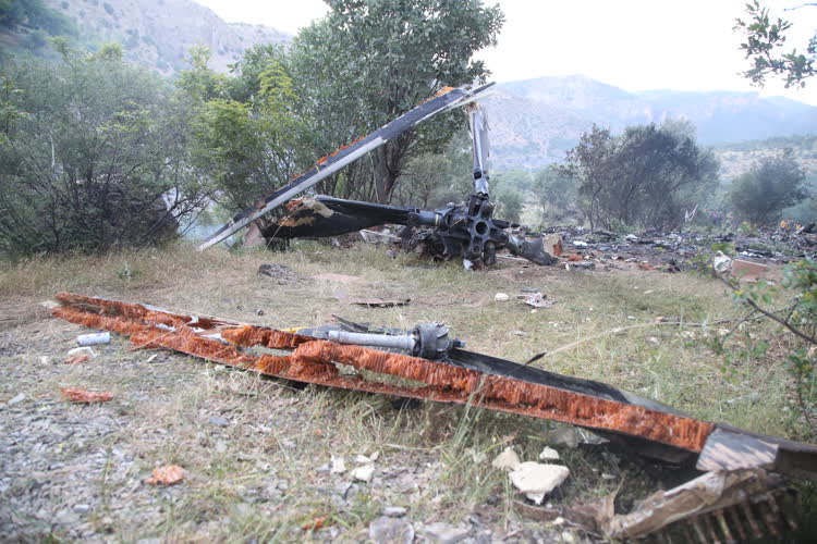Şırnak’ın Şenoba Tugay Komutanlığından kalkışından kısa bir süre sonra yüksek gerilim hatlarına takılması sonucu kaza kırıma uğrayan askeri helikopterin enkazı görüntülendi.