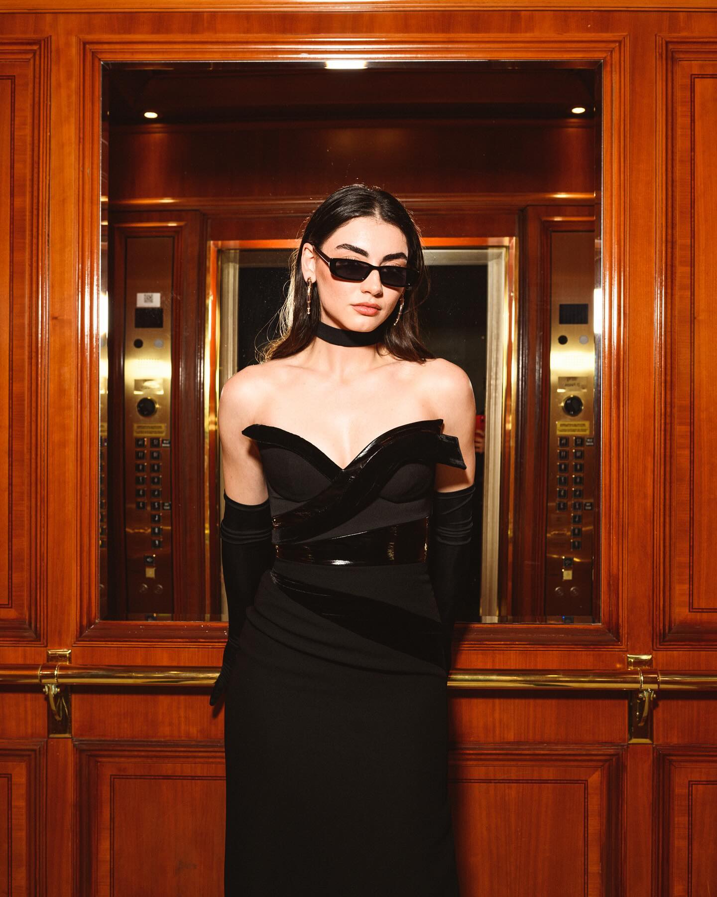 - Geceye siyah göğüs dekolteli elbisesiyle katılan güzel oyuncu kombinini siyah gözlükleri ve eldivenleri ile tamamladı.