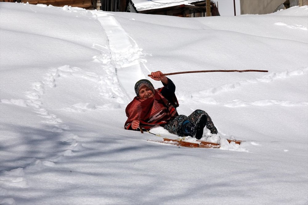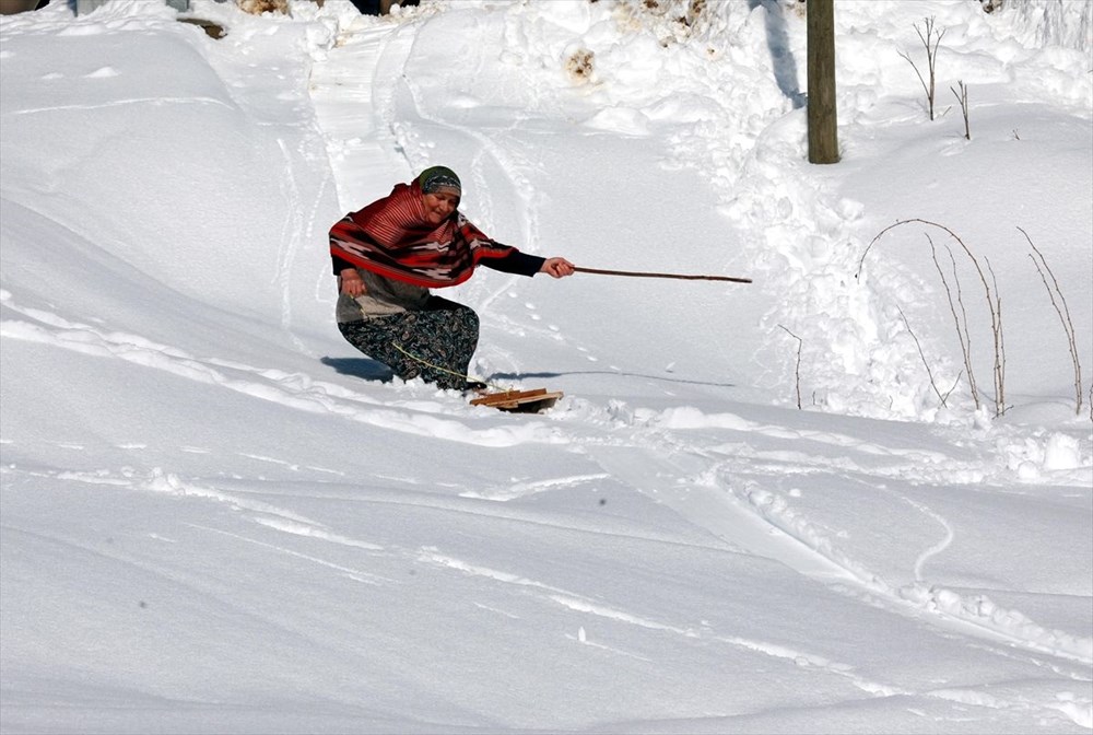 - Fatma Havuz ise 71 yaşında olmasına rağmen karın tadını çıkarmaya devam ediyor. Havuz, küçük yaşlarda öğrendiğini ve yaşının ilerlemesine karşın karda kaymanın keyfini çıkarmaya devam ettiğini belirterek, “Bizler de küçükken daha çok güzel yerlerde kayardık. Erkekler gibi gidemezdik ama ufak yerlerde tahtalarla yüzerdik. Şimdi yaşlandık ama eski yaptıklarımız aklımıza geldikçe kayıyoruz. Şimdi mart ayında son kar yağdı tadını çıkarıyoruz. Bundan sonra yağsa da kayak yapılmaz” diye konuştu.