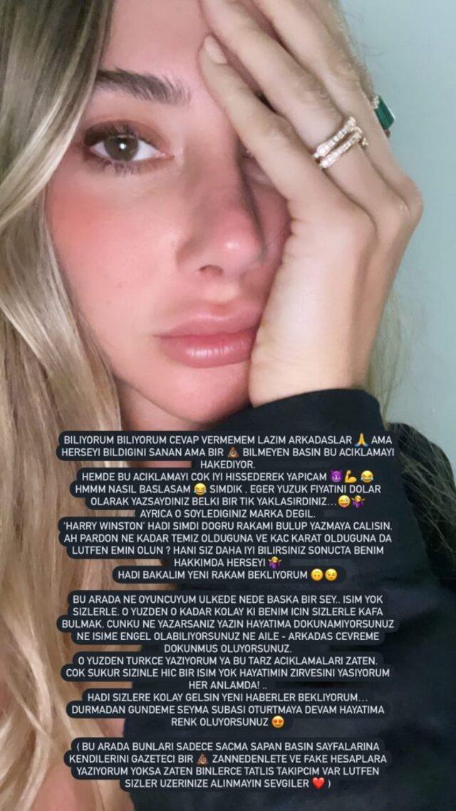 - Uzun zamandır yurt dışında yaşayan Şeyma Subaşı, geçtiğimiz günlerde mısırlı milyarder sevgilisinden evlilik teklifi aldı. Türkiye basınında gündem olan Subaşı, tektaş yüzüğü hakkında çıkan marka ve fiyat haberlerine sitem ederek basın mensuplarına tepki gösterdi.