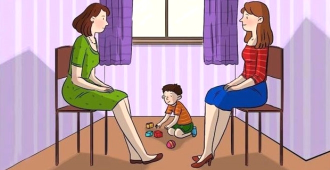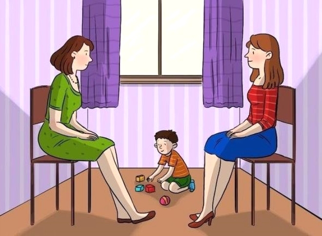 Odada oturan iki kadından biri yerdeki çocuğun annesi. Resmi dikkatlice inceleyin ve hangisi çocuğun annesi bulun..