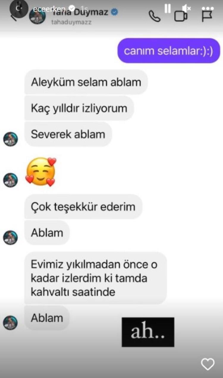 - 12 gündür enkaz altında olan Taha Duymaz’ın kız kardeşinin cansız bedenine ulaşıldı. Taha Duymaz’ın vefatının ardından Instagram üzerinden kendisine attığı mesajları paylaşan Ece Erken duyduğu üzüntüyü dile getirdi.