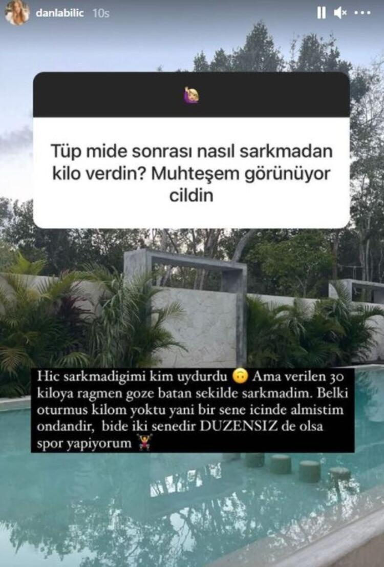 - Mide küçültme ameliyatı olan Bilic’e “Nasıl sarkmadın?” diye soruldu. Danla Bilic bu soruya “Hiç sarkmadığımı kim uydurdu? Ama verilen 30 kiloya rağmen göze batan şekilde sarkmadım” yanıtını verdi.