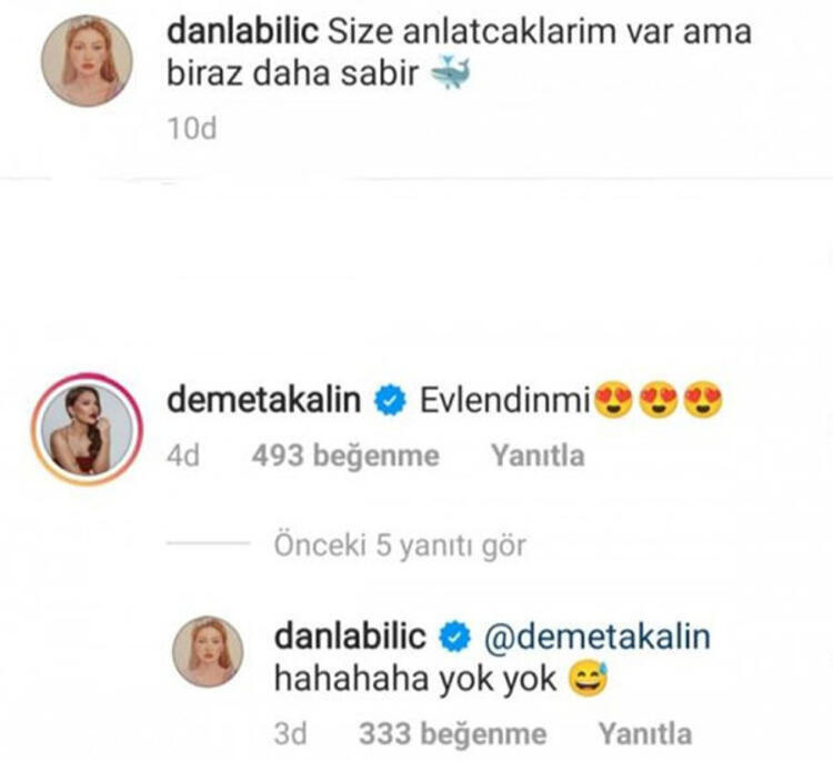 - DANLA BİLİC’TEN CEVAP… Kullanıcıların aklına o yorumdan sonra ‘evlendiler mi?’ sorusu gelirken, çok geçmeden Bilic’ten açıklama yaptı. 26 yaşındaki sosyal medya fenomeni, ünlü şarkıcının yorumuna, “Yok yok” diyerek yanıt verdi.