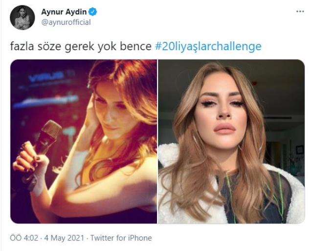 - Sosyal medyada başlayan 20’li yaşlara ait fotoğraf paylaşma akımına Aynur Aydın da dahil oldu. Bir konserinde çektirdiği fotoğrafı paylaşan şarkıcının pozunu gören takipçileri “Hiç değişmemişsin” yorumunda bulundu.
