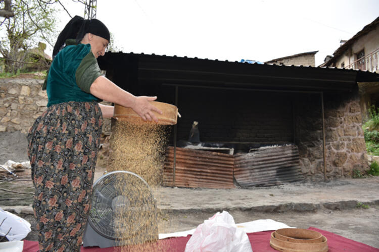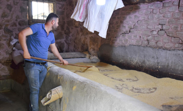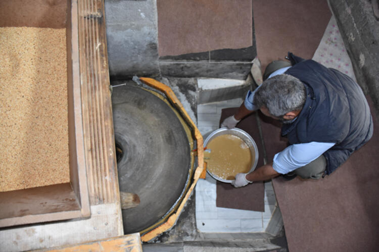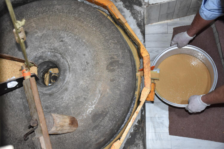 - Daha sonra Yeşil Çeşme Mahallesi’nde yaklaşık 400 yıllık, suyla çalışan taş değirmene götürülen susam, kadınlar tarafından elendikten sonra öğütülerek tahine dönüştürülüyor.