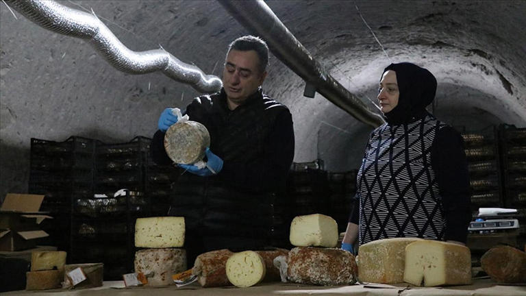 - Elde ettikleri sütü değerlendirmek için peynir üretmeye başladıklarını, mandıradaki üretimin ardından kaya depolara getirdiklerini anlatan Erbişim, “Burada beyaz bezlere sararak kasalarımıza koyuyoruz. Peynirlerin üzerini önce beyaz bir küf kaplıyor. Sonra mavimsi, yeşilimsi ve en sonunda da kırmızı renk alıyor. Kırmızı renk aldığında peynirler olgunlaşmış demektir. Bunların bezlerini çıkartarak üzerini temizleyip yeniden temiz beze sararak etiketliyoruz. Ardından otel ve restoranlara satış yapıyoruz.” diye konuştu. Erbişim, doğal halinde olgunlaşan ve fermente olan peynirlerin çok lezzetli olduğunu, bunun için de doğal depoları seçtiklerini dile getirdi. Dedelerinin yaylalara çıktığında yaptığı peynirleri mağaralarda bekleterek olgunlaştırdığını anlatan Erbişim, deponun sıcaklığının 8-12 derece, yazın nemin yüzde 99 olduğunu belirtti. Erbişim, nemin kışın düştüğünü ifade ederek, bu sıcaklık özelliklerinde peynirlerin mükemmel bir şekilde olgunlaştığını aktardı.