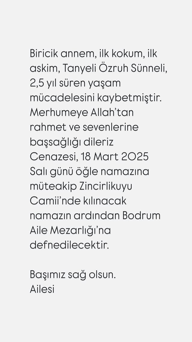 - “Biricik annem, ilk kokum, aşkım, Tanyeli Özruh Sünneli 2,5 yıl süren yaşam mücadelesini kaybetmiştir. Merhumeye Allah’tan rahmet ve sevenlerine baş sağlığı dileriz. Cenazesi 18 Mart 2025 Salı günü öğle namazına müteakip Zincirlikuyu Camii’nde kılınacak namazın ardından Bodrum Aile Mezarlığı’na defnedilecektir. Başımız sağ olsun. Ailesi” notunu düştü.