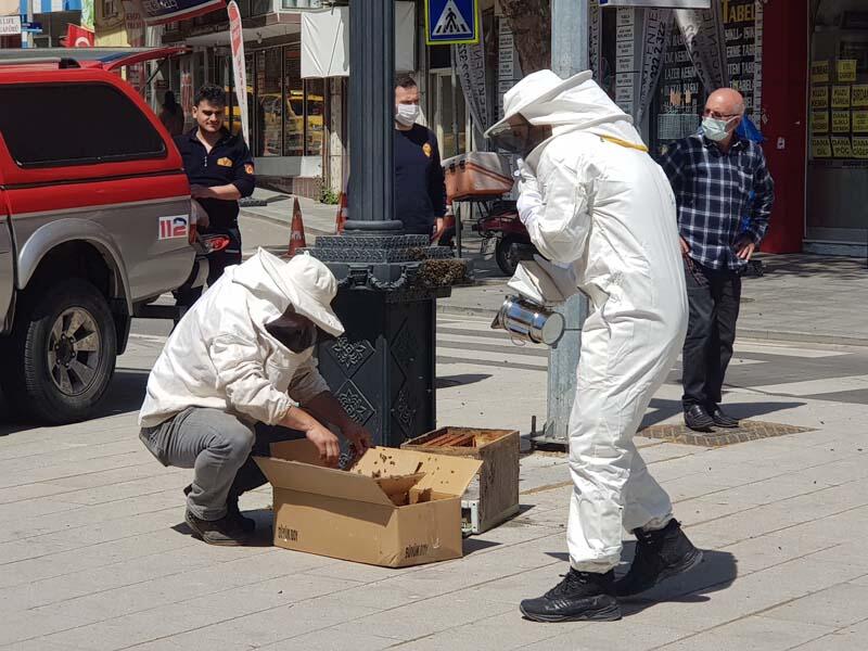 - Çevre esnafın ihbarı üzerine bölgeye itfaiye ekipleri sevk edildi. Bu sırada fırıncı Ekrem Çakmak, üzerindeki montu siper ederek arıları bulundukları yerden almak istedi.
