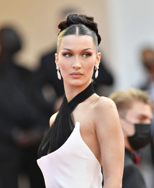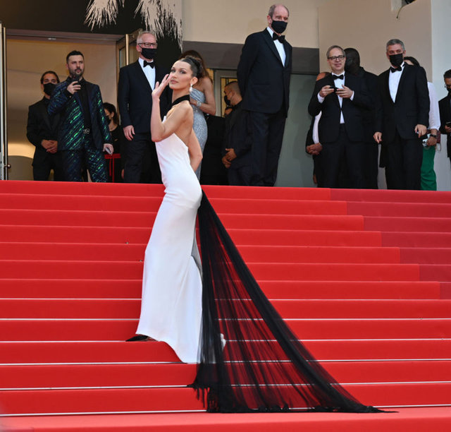- 24 yaşındaki Hadid, Annette filminin galası için beyaz renginin ağırlıkta olduğu Jean Paul Gaultier imzalı vintage bir elbise ile boy gösterdi.