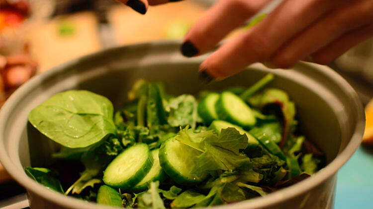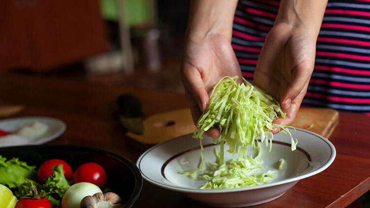 - Büyük bir kapta marul yaprakları, havuç, salatalık, turp, soğan ve diğer yeşillikleri bir araya getirin.
