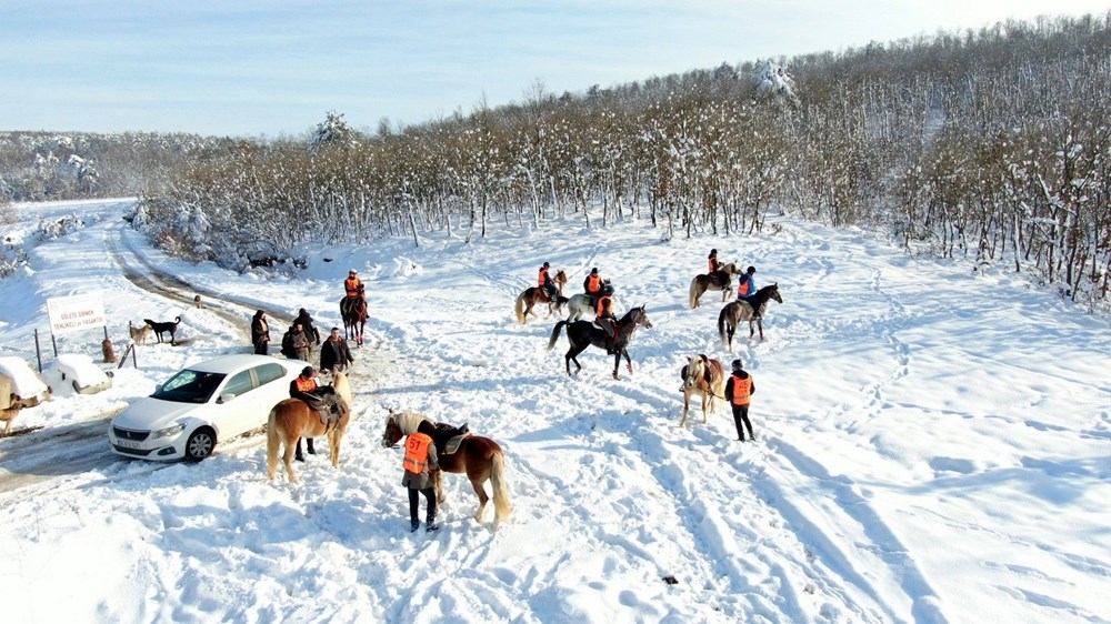 - “Karların altında ata binmek isteyen vatandaşlarımız bizimle iletişime geçebilirler” diyerek sözlerini sürdüren Şeyda Çilek Cihan, “Genelde kış sporları denildiği zaman ilk akla kayak geliyor. Ama bunun yanı sıra binicilik de çok farklı ve güzel bir spor dalı. Arazi ve orman turlarında at binmeyi bilmenize gerek yok. Herhangi binicilik geçmişiniz olmasına da gerek yok. Bu turlara katılmak için bir atınızın olmasına da gerek yok. Siz buraya geldiğinizde tüm binicilik ekipmanları size temin ediliyor. Profesyonel antrenör eşliğinde arazide karların üstünde at sürmenin keyfini çıkartabiliyorlar” diye konuştu.
