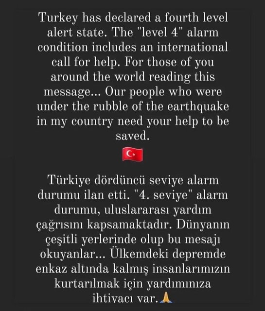 - ÇAĞLA ŞIKEL: Türkiye dördüncü seviye alarm durumu ilan etti. ‘4. seviye’ alarm durumu, uluslararası yardım çağrısını kapsamaktadır. Dünyanın çeşitli yerlerinde olup, bu mesajı okuyanlar… Ülkemdeki depremde enkaz altında kalmış insanlarımızın kurtarılmak için yardımınıza ihtiyacı var. Ah, çok üzgünüm. Allah yardımcımız olsun. Yaralılar ve kurtarılmayı bekleyenler için dua edelim. Başımız sağ olsun.