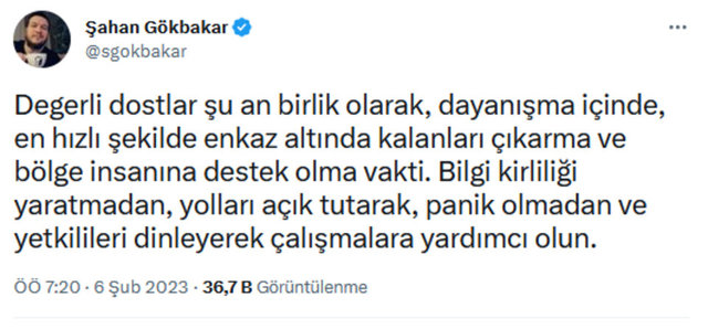 - ŞAHAN GÖKBAKAR: Değerli dostlar; şu an birlik olarak, dayanışma içinde, en hızlı şekilde enkaz altında kalanları çıkarma ve bölge insanına destek olma vakti. Bilgi kirliliği yaratmadan, yolları açık tutarak, panik olmadan ve yetkilileri dinleyerek çalışmalara yardımcı olun.
