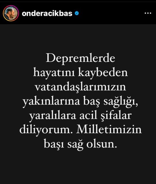 - ÖNDER AÇIKBAŞ: Depremlerde hayatını kaybeden vatandaşlarımızın yakınlarına başsağlığı, yaralılara acil şifalar diliyorum. Milletimizin başı sağ olsun.