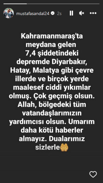 - MUSTAFA SANDAL: Kahramanmaraş’ta meydana gelen 7,4 şiddetindeki depremde Diyarbakır, Hatay, Malatya gibi çevre illerde ve birçok yerde maalesef ciddi yıkımlar olmuş. Çok geçmiş olsun. Allah bölgedeki tüm vatandaşlarımızın yardımcısı olsun. Umarım daha kötü haberler almayız. Dualarımız sizlerle…