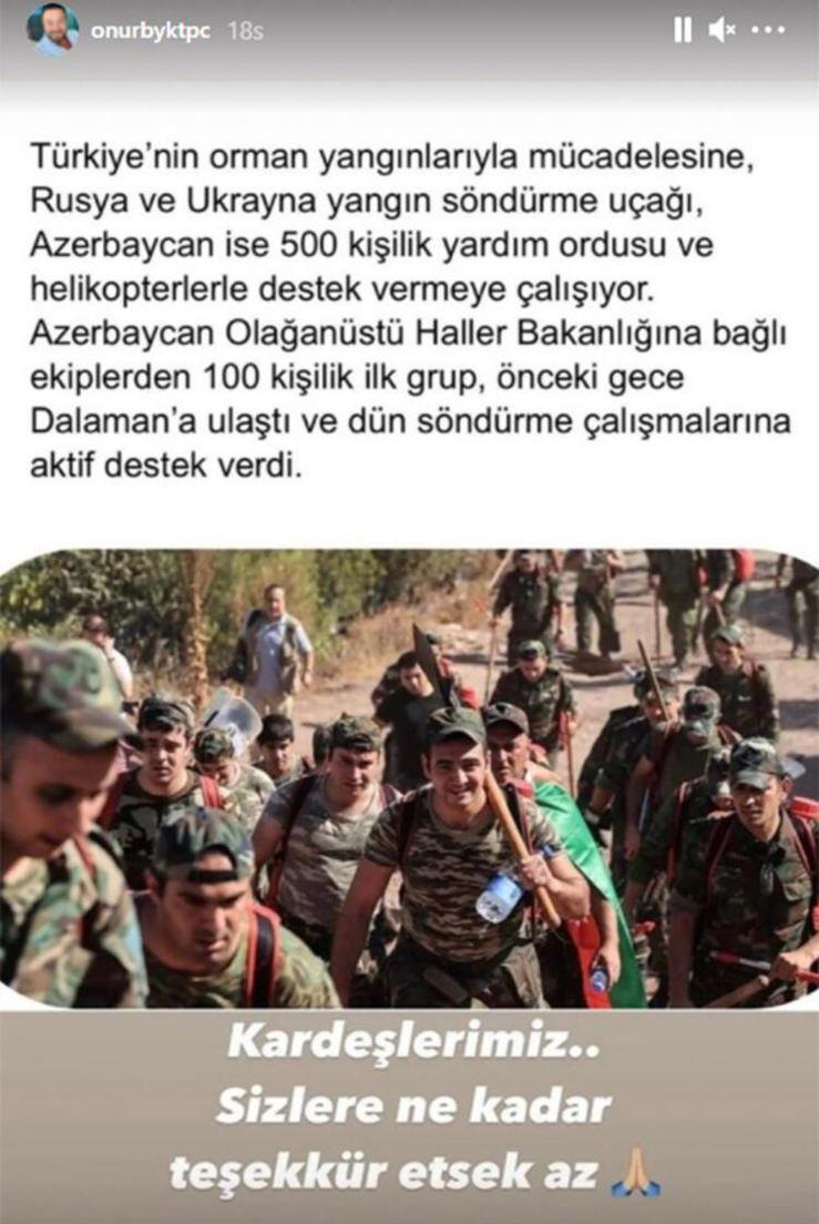 - Büyüktopçu, bir diğer paylaşımına ise “Türkiye’nin orman yangınlarıyla mücadelesine, Rusya ve Ukrayna yangın söndürme uçağı, Azerbaycan ise 500 kişilik yardım ordusu ve helikopterle destek vermeye çalışıyor. Azerbaycan Olağanüstü Haller Bakanlığı’na bağlı ekiplerden 100 kişilik ilk grup, önceki gece Dalaman’a ulaştı ve dün söndürme çalışmalarına aktif destek verdi. Kardeşlerimiz sizlere ne kadar teşekkür etsek az” mesajını yazdı.