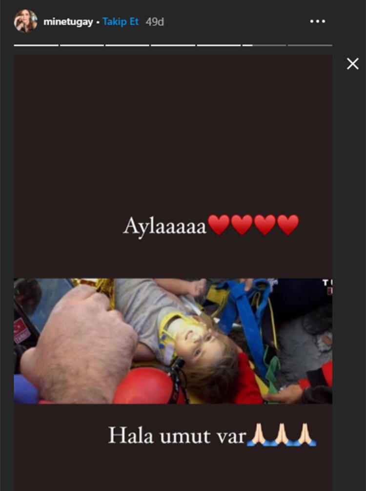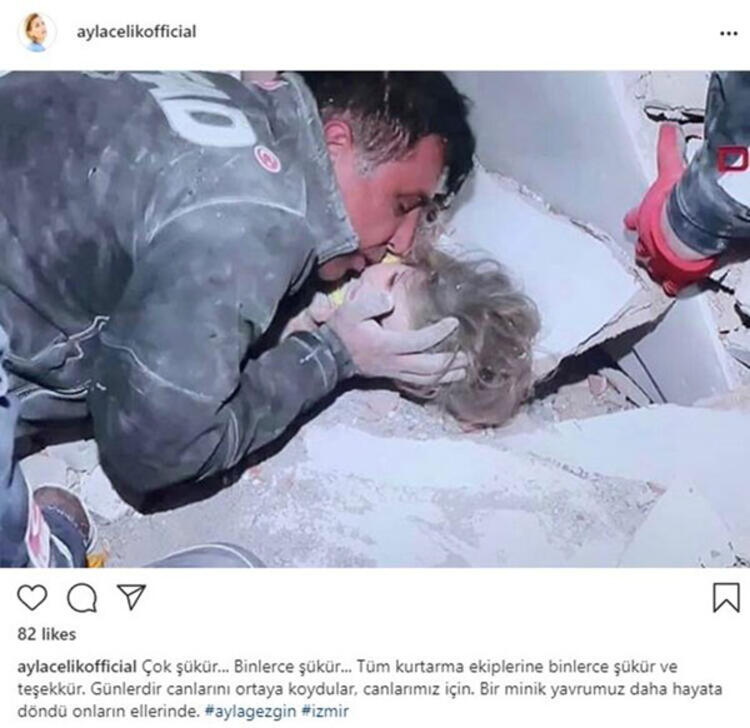 - AYLA ÇELİK “Çok şükür… Binlerce şükür… Tüm kurtarma ekiplerine binlerce şükür ve teşekkür. Günlerdir canlarını ortaya koydular, canlarımız için. Bir minik yavrumuz daha hayata döndü onların ellerinde.”