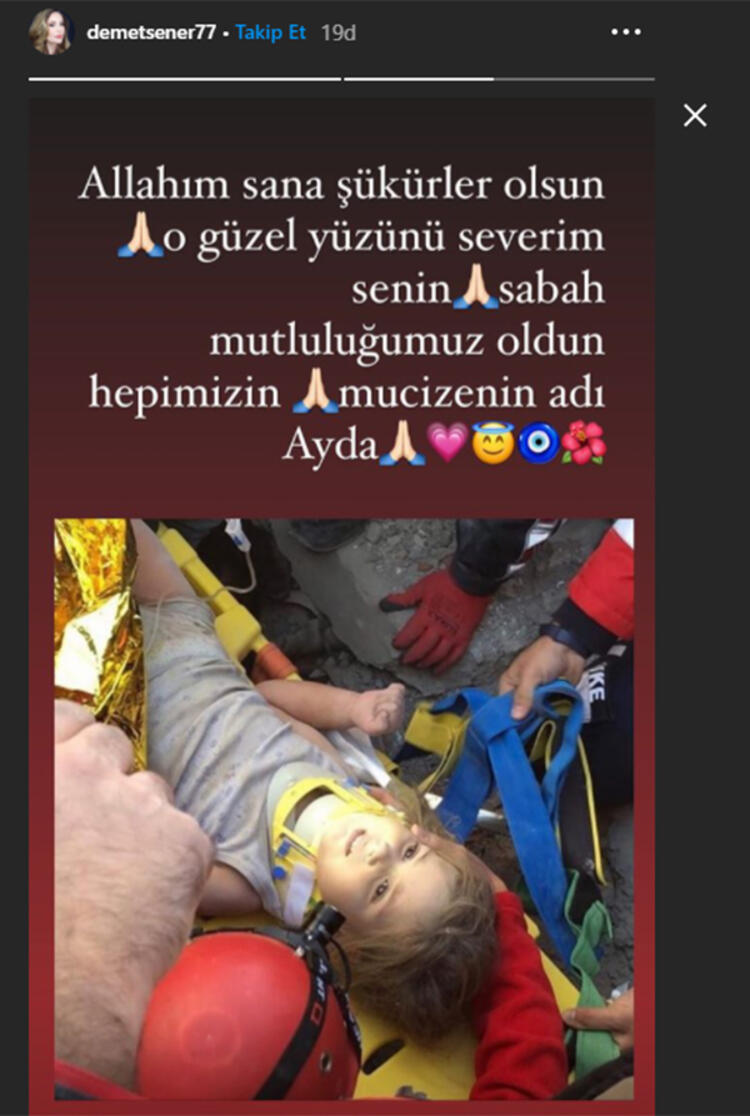 - DEMET ŞENER “Allah’ım sana çok şükür… O güzel yüzünü severim senin. Sabah mutluluğumuz oldun hepimizin. Mucizenin adı Ayda”