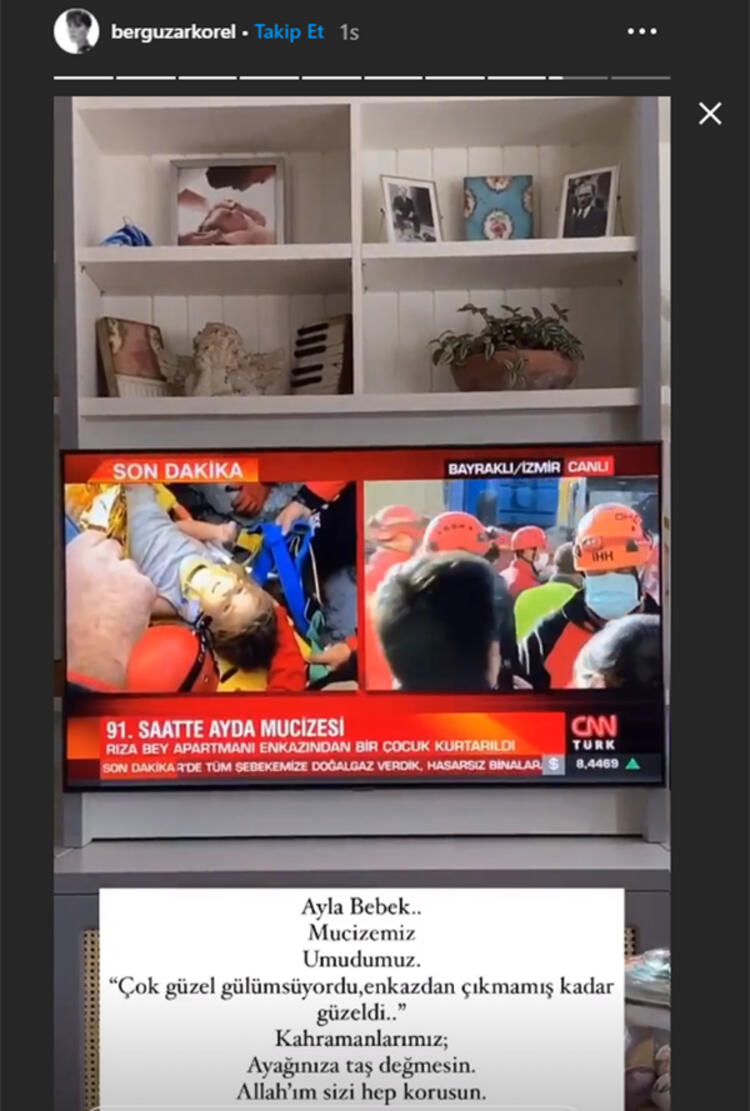- BERGÜZAR KOREL “Ayda bebek… Mucizemiz… Umudumuz… ‘Çok güzel gülümsüyordu, enkazdan çıkmamış kadar güzeldi.’ Kahramanlarımız ayağınıza taş değmesin. Allah’ım sizi hep korusun”
