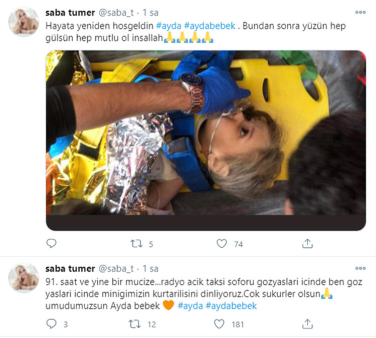 - SABA TÜMER “91. saat ve yine bir mucize…Radyo açık taksi şoförü gözyaşları içinde; ben gözyaşları içinde miniğimizin kurtarılışını dinliyoruz. Çok şükürler olsun. Umudumuzsun Ayda bebek. Hayata yeniden hoş geldin Ayda. Bundan sonra yüzün hep gülsün, hep mutlu ol inşallah…”