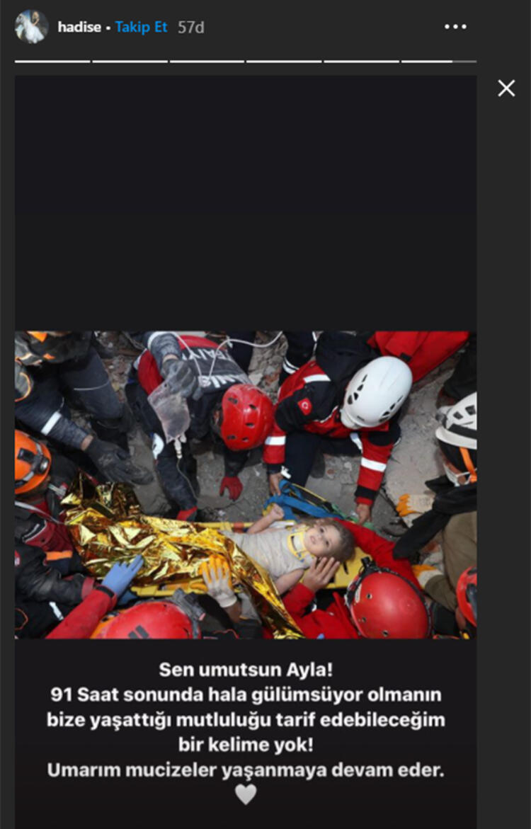 - HADİSE “Sen umutsun Ayda. 91 saat hala gülümsüyor olmanın bize yaşattığı mutluluğu tarif edebileceğim bir kelime yok. Umarım mucizeler yaşanmaya devam eder.”