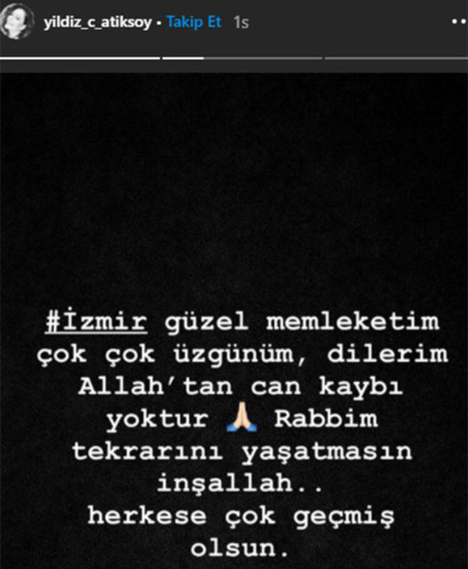 - YILDIZ ÇAĞRI ATİKSOY: İzmir, güzel memleketim… Çok çok üzgünüm. Dilerim Allah’tan can kaybı yoktur. Rabbim tekrarını yaşatmasın inşallah. Herkese çok geçmiş olsun.