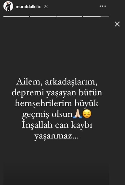 - MURAT DALKILIÇ: Ailem, arkadaşlarım, depremi yaşayan bütün hemşehrilerim… Büyük geçmiş olsun. İnşallah can kaybı yaşanmaz.