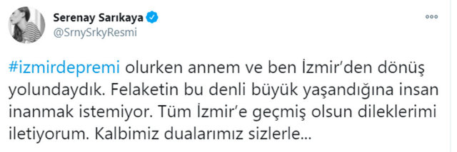 - SERENAY SARIKAYA: İzmir Depremi olurken annem ve ben İzmir’den dönüş yolundaydık. Felaketin bu denli büyük yaşandığına insan inanmak istemiyor. Tüm İzmir’e geçmiş olsun dileklerimi iletiyorum. Kalbimiz, dualarımız sizlerle…