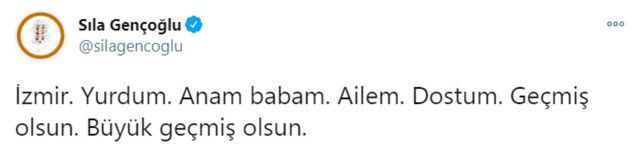 - SILA GENÇOĞLU: İzmir, yurdum, anam, babam, ailem, dostum… Geçmiş olsun. Büyük geçmiş olsun.