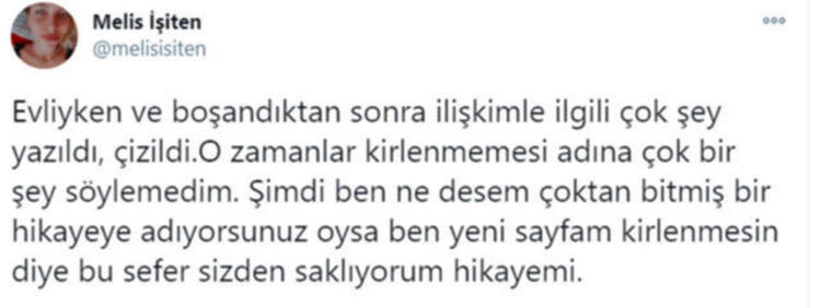 - “İLİŞKİMLE İLGİLİ ÇOK ŞEY YAZILDI” Kısa bir süre sonra gönderisini kaldıran Melis İşiten, ardından şu ifadeleri kullanmıştı: Evliyken ve boşandıktan sonra ilişkimle ilgili çok şey yazıldı, çizildi. O zamanlar kirlenmemesi adına çok bir şey söylemedim. Şimdi ben ne desem çoktan bitmiş bir hikayeye adıyorsunuz. Oysa ben yeni sayfam kirlenmesin diye bu sefer sizden saklıyorum hikayemi.