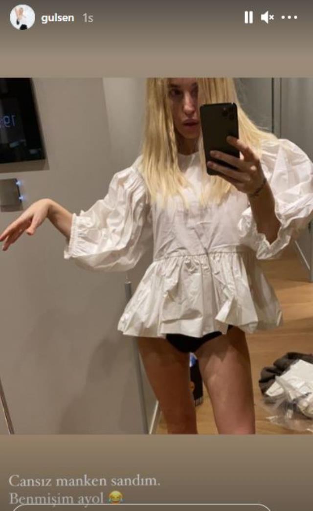 - “CANSIZ MANKEN SANDIM” Gülşen, ayna karşısında kıyafet denediği sırada altında sadece iç çamaşırı varken paylaşım yaptı. Hikayesinin altına “Cansız manken sandım, benmişim ayol” notunu ekledi. (haberler.com)