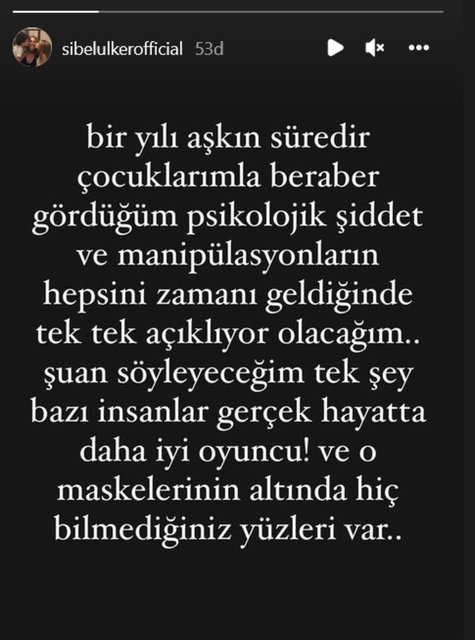 - “BAZI İNSANLAR GERÇEK HAYATTA DAHA İYİ OYUNCU!” Uzun süredir birlikte görüntü vermeyen çift, sosyal medya hesaplarından birbirlerini sildi. Instagram hesabından sert bir açıklama yapan Sibel Ülker, “Bir yılı aşkın süredir çocuklarımla beraber gördüğüm psikolojik şiddet ve manipülasyonların hepsini zamanı geldiğinde tek tek açıklıyor olacağım… Şu an söyleyeceğim tek şey bazı insanlar gerçek hayatta daha iyi oyuncu! Ve o maskelerinin altında hiç bilmediğiniz yüzleri var!” mesajını paylaştı.