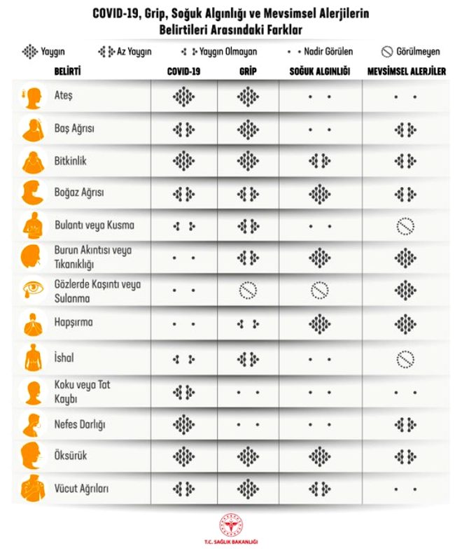 - Sağlık Bakanlığı, dünya genelinde görülen ve binlerce kişinin ölümüne neden olan yeni tip koronavirüs (Kovid-19) ile sık görülen diğer üst solunum yolu hastalıklarının belirtileri arasındaki farkların yer aldığı güncel tabloyu yayınladı.