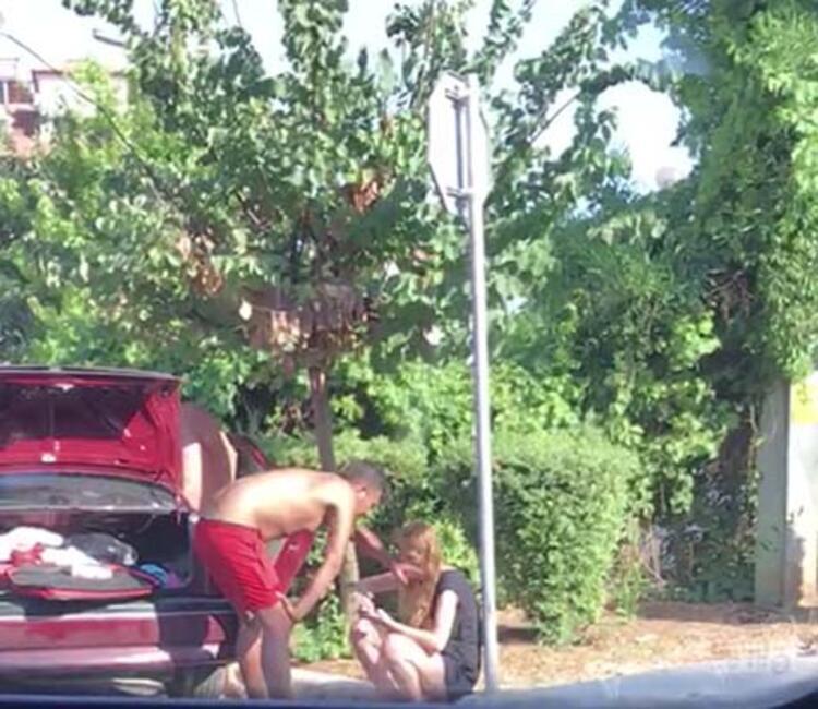- Görüntülerde, Sinan A. ile tartışan Ayşenur A., araçlarından çantasını alıp kaldırıma oturuyor, bu sırada Sinan A. eşine yaklaşarak tokat ve yumruk atıyor. Ayşenur A.’nın da Sinan A.’ya karşılık verdiği görülüyor.