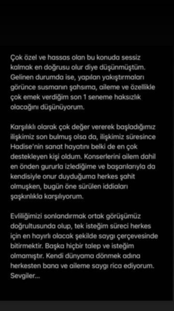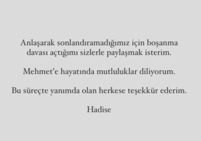 - HADİSE’DEN AÇIKLAMA… Çıkan haberlerin ardından ünlü şarkıcı, Instagram hesabından şu açıklamayı yapmıştı: Anlaşarak sonlandıramadığımız için boşanma davası açtığımı sizlerle paylaşmak isterim. Mehmet’e hayatında mutluluklar diliyorum. Bu süreçte yanımda olan herkese teşekkür ederim.