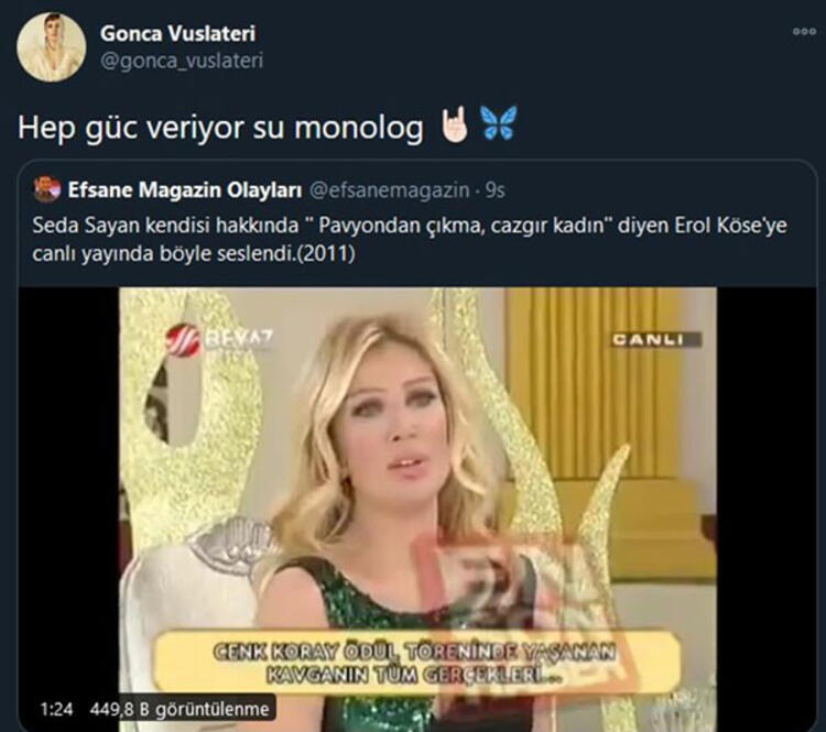 - “Goncacığım, 10 yıl geç kaldın! Artık biz Seda Sayan ile küs değiliz. Zaman aşımına uğradı. Senin zekana yakıştıramadım. Senin seviyen buysa benim de bu düzeyde misilleme yapma hakkım var. Hazır ol!”