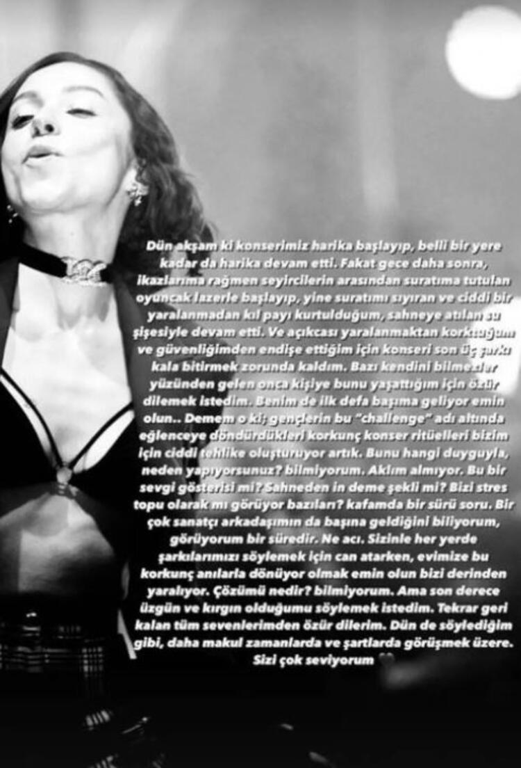 - Zeynep Bastık açıklamasını şu şekilde tamamladı: “Açıkcası yaralanmaktan korktuğum ve güvenliğimden endişe ettiğim için konseri son üç şarkı kala bitirmek zorunda kaldım.