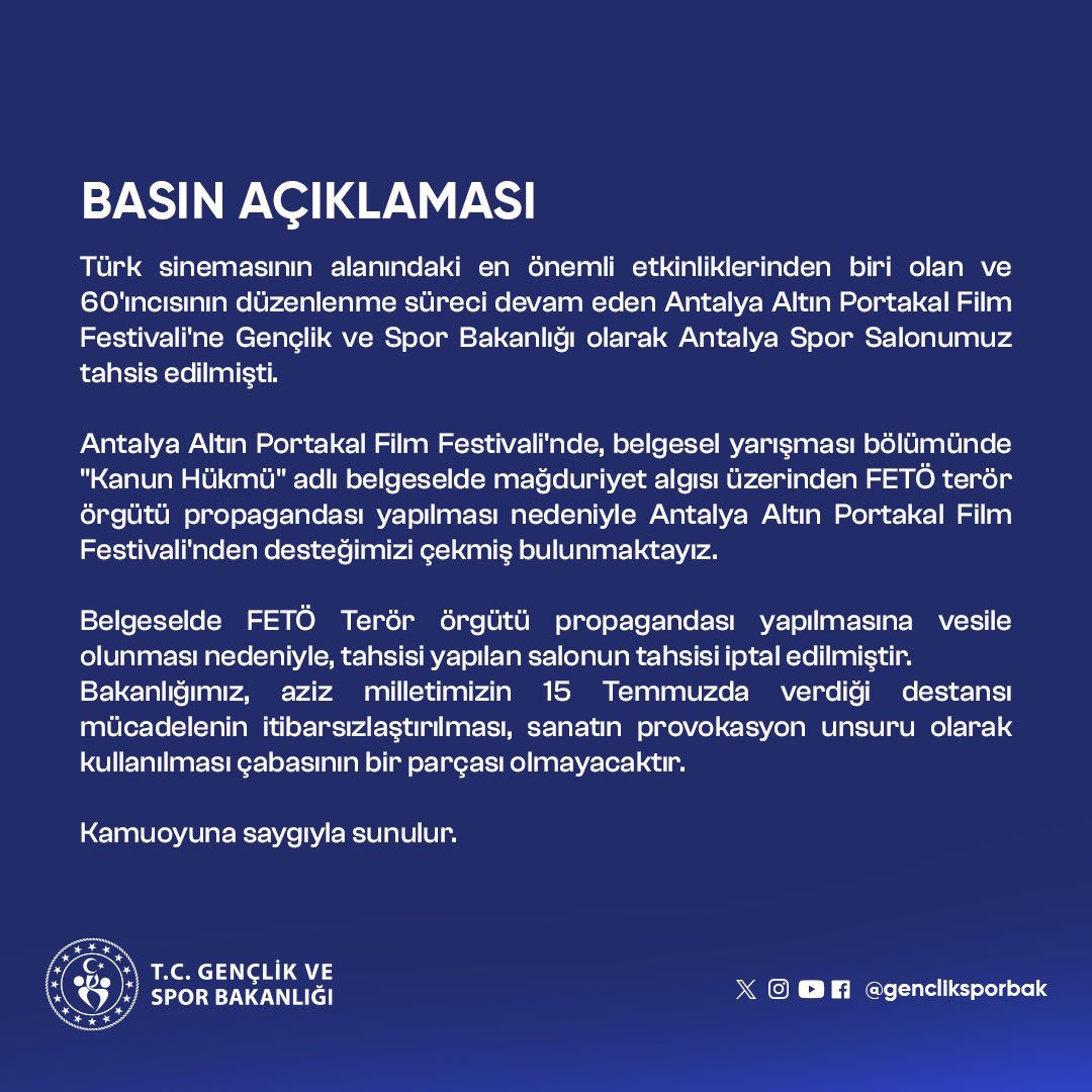 Kültür ve Turizm Bakanlığı’nın festivalden “Kanun Hükmü” belgeseli nedeniyle desteğini çekme kararı sonrası Gençlik ve Spor Bakanlığı, “Antalya Altın Portakal Film Festivali’nden desteğimizi çekmiş bulunmaktayız” açıklamasında bulundu.